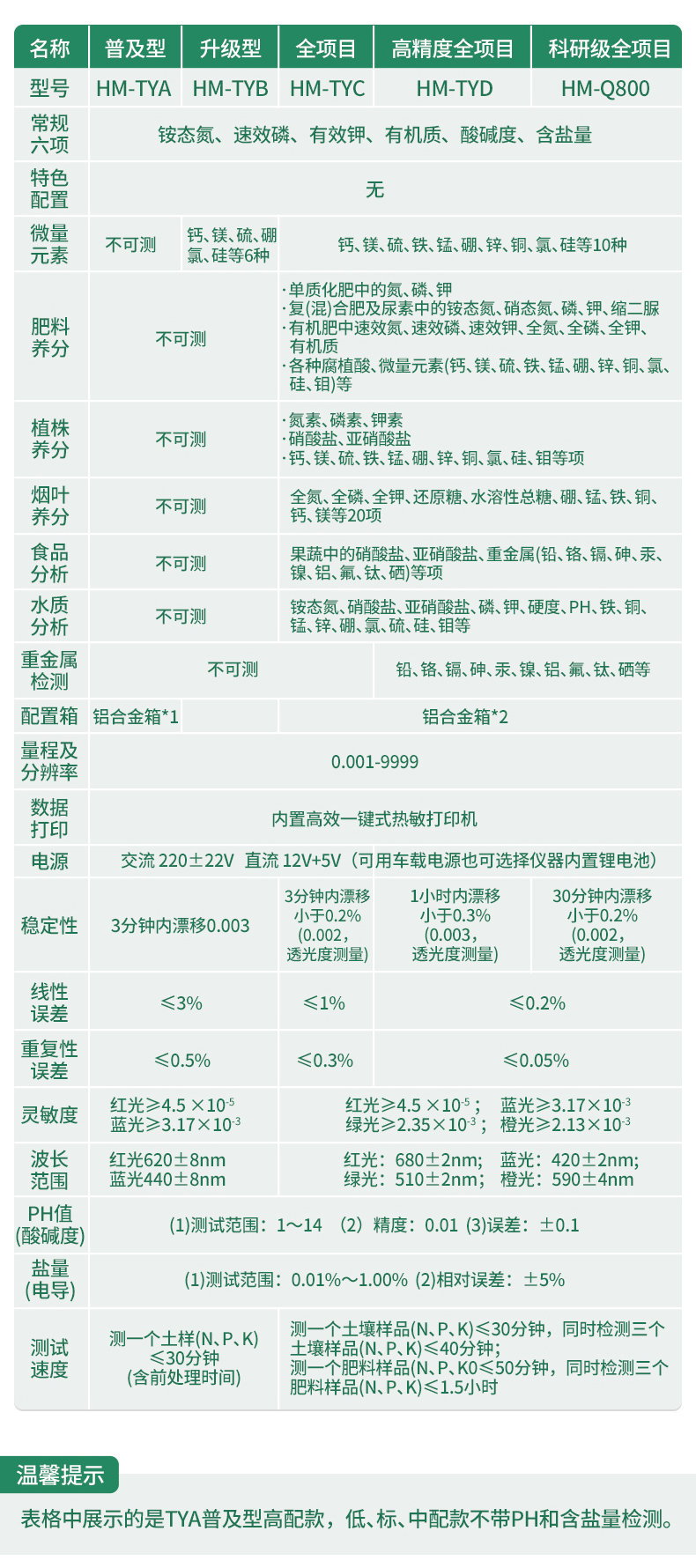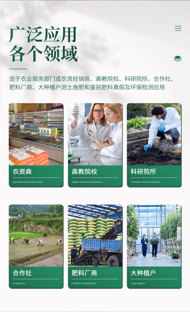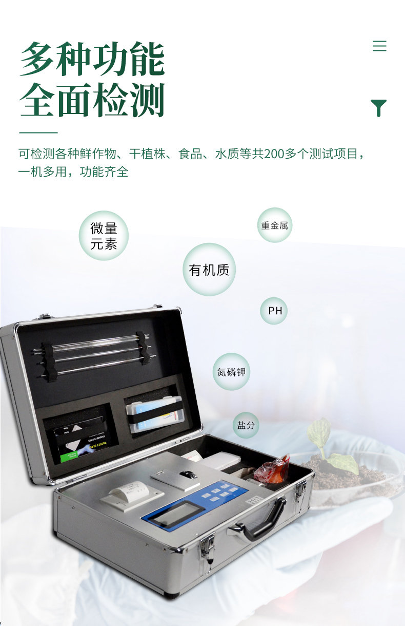 配套齊全:該儀器集藥、器、儀為一體,攜帶方便,相當于一個小型實驗室。適于農業服務部門或農資經銷商、肥料廠商測土施肥和鑒別肥料真假。
