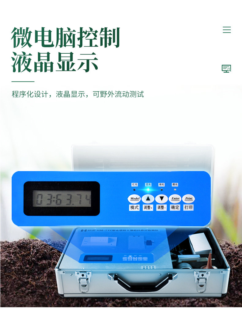 【產品簡介】一體式鋁合金機箱,液晶顯示,可檢測土壤、肥料、植株氮磷鉀、有機質(重復性誤差≤0.3%,線性誤差≤1%)